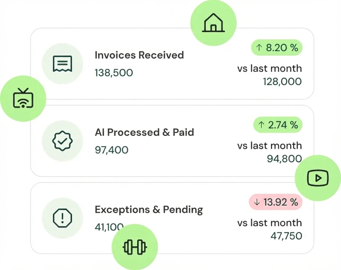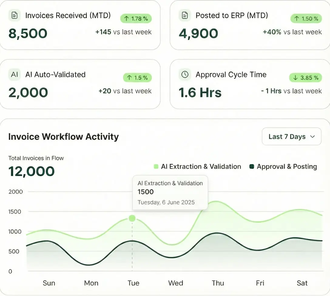 See cycle times, bottlenecks, vendor performance, and early-payment discount opportunities at a glance. Turn AP from a cost center into a data-rich control tower powered by LLM-driven analytics.